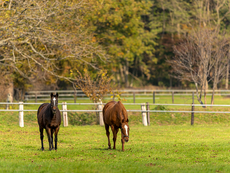 放牧時間は、季節や天候、気温などによって変えているそうで、秋シーズンは朝6時くらいから早めの夕方くらいまで。2頭が放たれている放牧地は、自宅の居間から見渡すことができる位置にあり「馬が入りたいような仕草をすれば、途中で厩舎に戻すこともあります」とのこと。「なるべく青草を食べさせてあげたい」と放牧時間は大切にしたいとのことで、その青草もなるべく柔らかく、栄養価の高いものを用意しているそうです。そして年齢的なことを考慮して「エサは当歳用の柔らかいものを使い、オーナー(下河辺牧場)の意向で削蹄は2か月に1回行っています」と馬ファーストの飼養管理を心がけているそうで、寒がりだというロンドンブリッジのために「ほかの馬に比べると少し早いかもしれませんが、そろそろ馬服を着せようかと思っています」と愛情を注がれています。