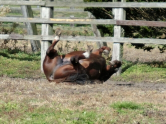 放牧地では一頭ですが、時々、遠方から雌馬の姿が見えると、やっぱりわかるのでしょうね。