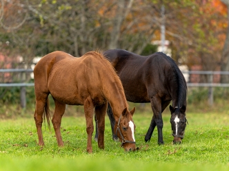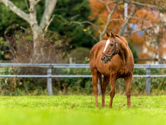 放牧時間は、季節や天候、気温などによって変えているそうで、秋シーズンは朝6時くらいから早めの夕方くらいまで。2頭が放たれている放牧地は、自宅の居間から見渡すことができる位置にあり「馬が入りたいような仕草をすれば、途中で厩舎に戻すこともあります」とのこと。「なるべく青草を食べさせてあげたい」と放牧時間は大切にしたいとのことで、その青草もなるべく柔らかく、栄養価の高いものを用意しているそうです。そして年齢的なことを考慮して「エサは当歳用の柔らかいものを使い、オーナー(下河辺牧場)の意向で削蹄は2か月に1回行っています」と馬ファーストの飼養管理を心がけているそうで、寒がりだというロンドンブリッジのために「ほかの馬に比べると少し早いかもしれませんが、そろそろ馬服を着せようかと思っています」と愛情を注がれています。