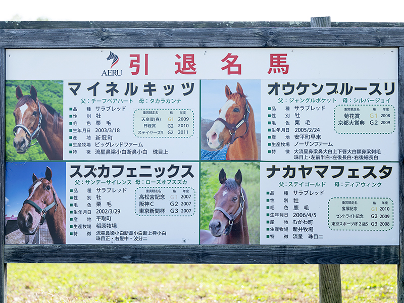 ファンが多くとても人気がある馬です。AERUで元気に過ごしているので、ぜひ見学に来てください。