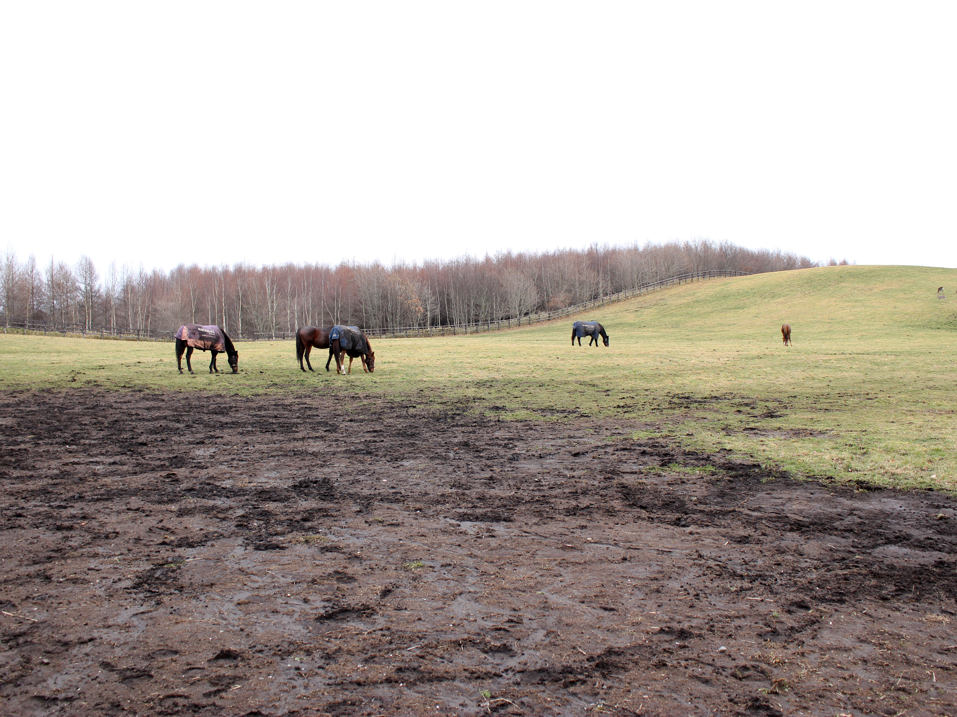 現在の放牧地は、厩舎から1番離れている場所なので、出すときは1番最初ですが収牧は1番最後だそうです。群れで生活する馬たちは何事に対しても順番があって、とくにエサを与える順番であるとか、厩舎に戻るときなどは1番強いリーダー格の馬から順番に行っていかなければ機嫌が悪くなる馬も珍しくないのですが、グランプリボスはその名前からイメージする姿とは無縁で、そんな争いを横目にゆっくりと順番を待っているそうです。